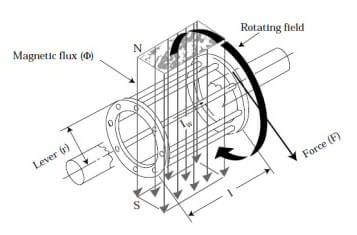 Bir rotor çubuğu döner alana yerleştirildiğinde, bir manyetik kutup çubuktan geçer. Kutupun manyetik alanı rotor çubuğunda sadece kuvvet (F) tarafından etkilenen bir akımı (Iw) indükler. Bu kuvvet, akı yoğunluğu (Φ), indüklenen akım (Iw), rotorun uzunluğu (l) ve kuvvet ile akı yoğunluğu arasındaki açı (Θ) ile belirlenir: